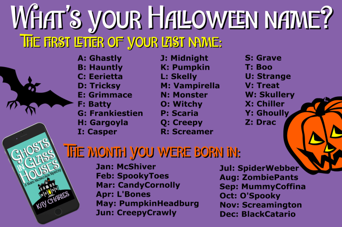 To enter,  go to my Facebook page and post your Halloween Name in the comments on the first post a chance to win.  (Note: Please follow the link and comment on Kay’s page. I’ll try to make sure everyone who comments is entered and don’t want to miss anyone who commented elsewhere.)